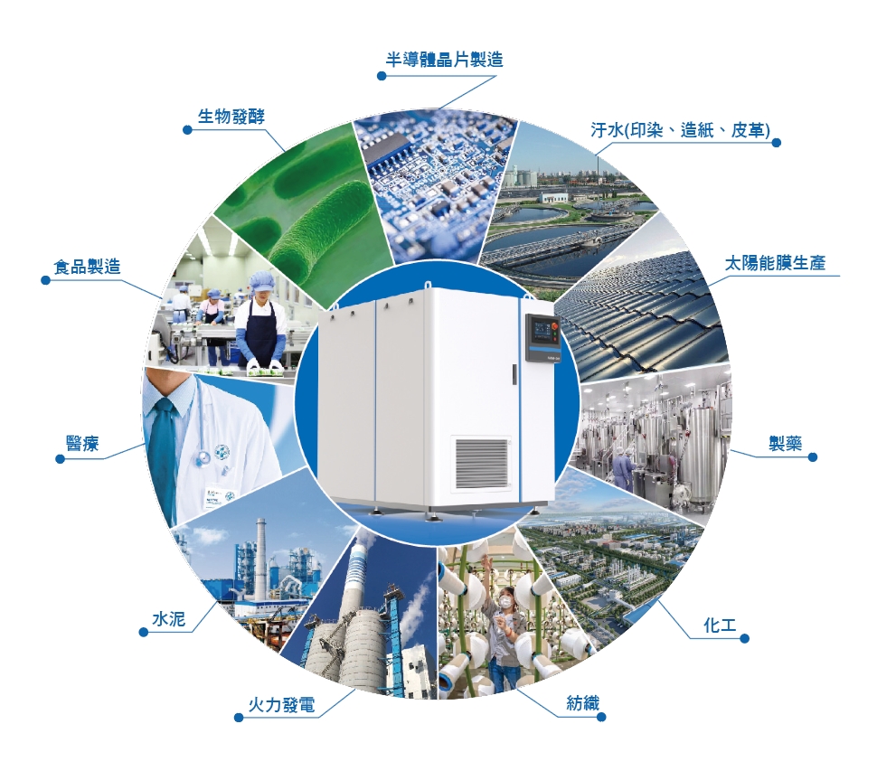 污水(印染、造紙、皮革)、 水泥、火力發電、紡織、半導體晶片製造、製藥、化工、醫療、